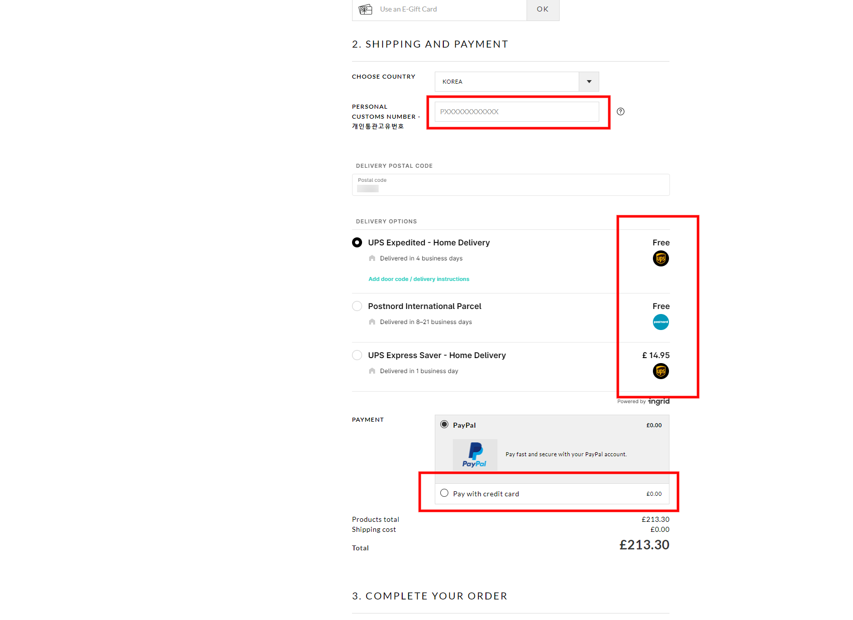 할인코드까지 입력하셨다면, 이제는 배송과 결제 방법을 선택하실 차례입니다. CHOOSE COUNTRY에서는 KOREA 를 선택해 주시고요, 개인통관고유부호란에 개인통관고유부호를 입력해 줍니다. DELIVERY POSTAL CODE에는 받으시는 곳의 우편번호를 입력해주세요.