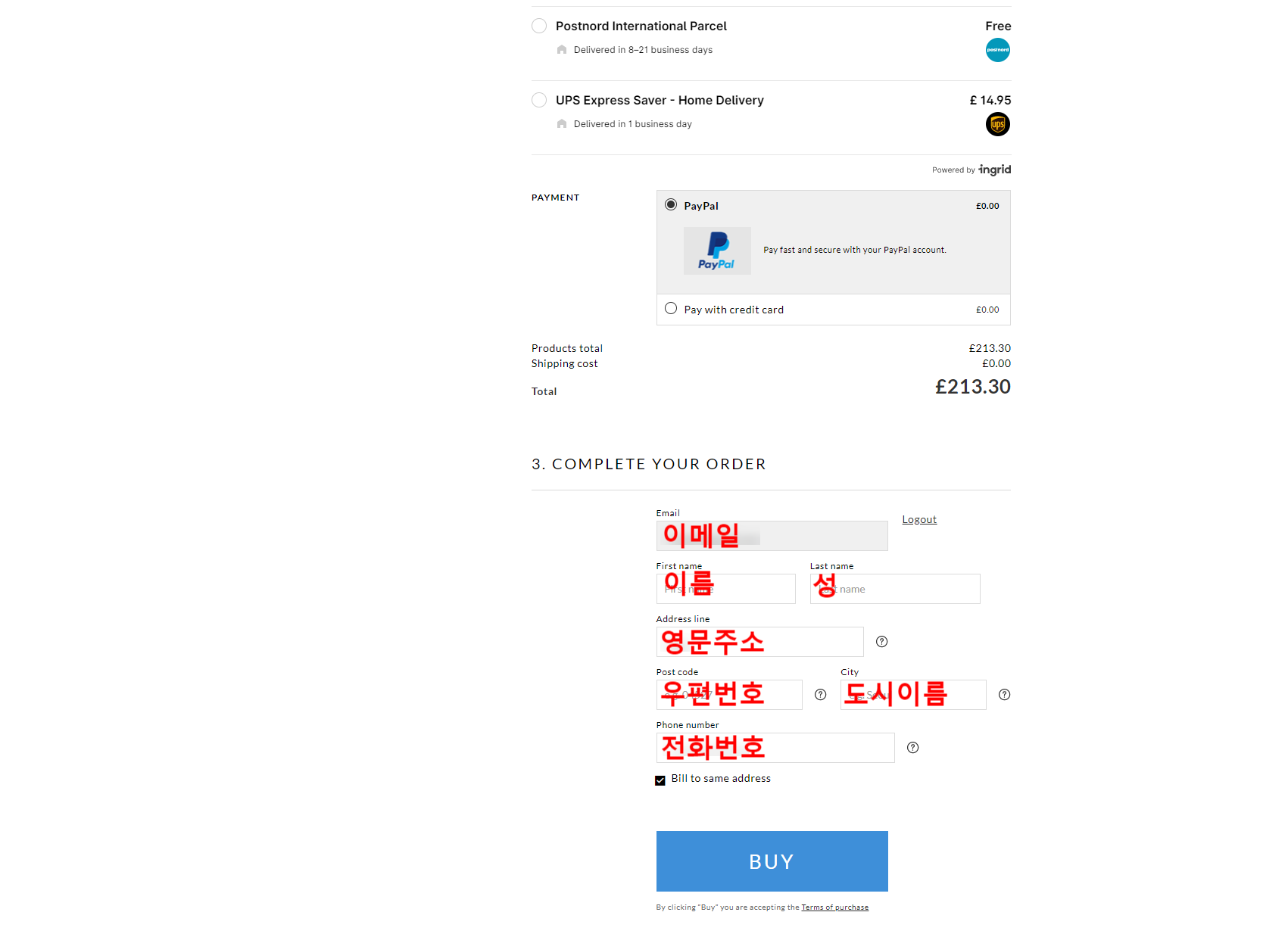 자 이제 거의 다 와갑니다. COMPLETE YOUR ORDER에서 이메일, 이름, 성, 배송받으실 곳의 영문주소 (관련 글 : 아파트 동호수 영문주소 변환기 이용하여 영문주소변환 방법), 우편번호, 도시 이름, 전화번호를 입력합니다. 숫자와 영문으로만 입력하셔야 된다는 점 잊지 마시고요. 모두 입력하셨다면 아래 'BUY' 버튼을 클릭하여 다음으로 넘어갑니다.