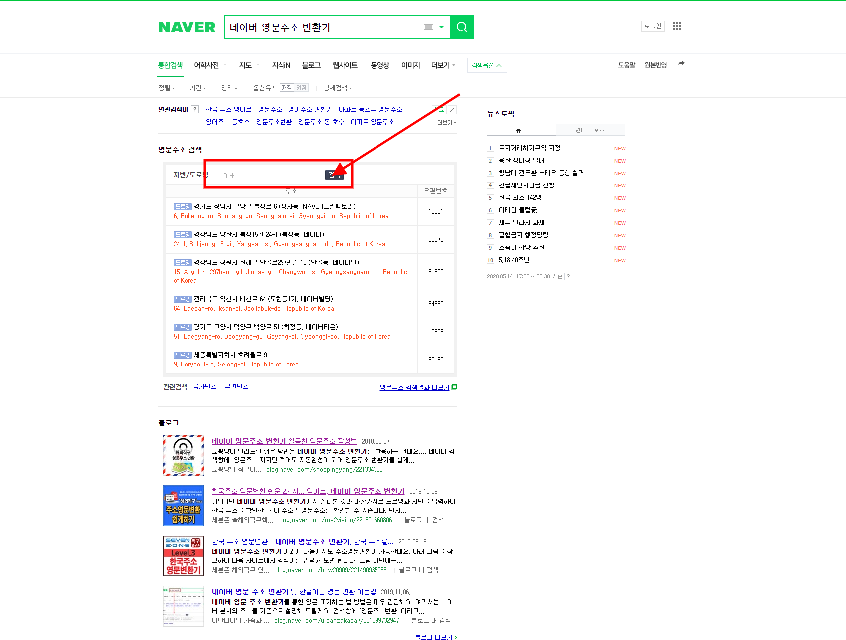 우리나라 대표 포털인 네이버에서도 영문주소 변환기를 제공하고 있습니다. 네이버에 접속하여 '영문주소 변환기'라고 검색하시면 네이버에서 제공하는 영문주소 변환기로 연결이 됩니다. 네이버 영문주소 변환기 직접 링크는 글 하단에 남겨 놓았으니 참고해 주세요.