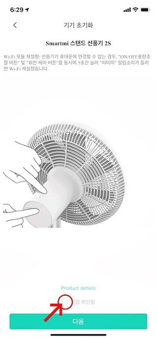 ‘삐삐삐’ 소리를 확인하셨다면, 다시 스마트폰의 샤오미 미홈 어플로 돌아와서 페이지 하단의 ‘작업 확인됨’에 체크 후 다음을 클릭하여 넘어갑니다.