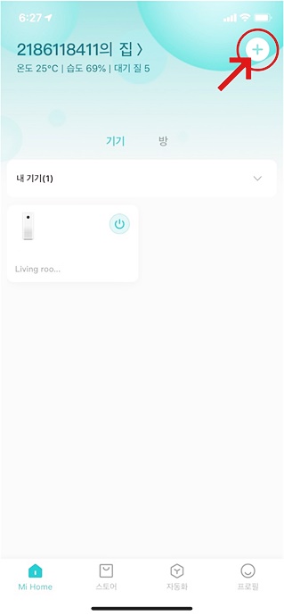 우선 샤오미 미홈 어플을 실행합니다. 저의 경우 이미 기존에 샤오미 공기청정기를 샤오미 미홈 어플에 등록하여 사용하고 있기 때문에 등록 된 기기 목록에 공기청정기가 뜨지만, 처음으로 샤오미 미홈 어플을 사용하는 분이라면 목록에 아무런 기기도 뜨지 않을 것입니다.